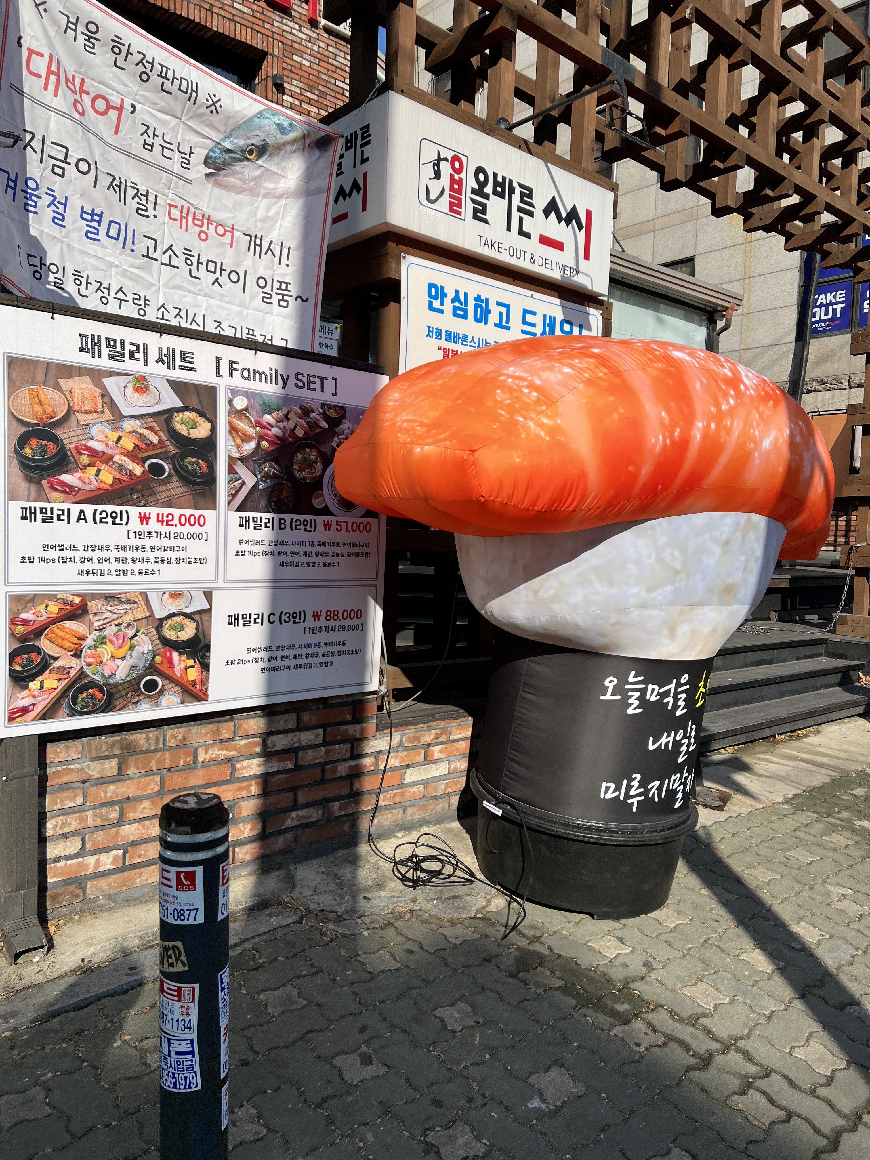 as you head towards the end, you’ll see the restaurant on the right with the big sushi!make sure to cross the road properly!