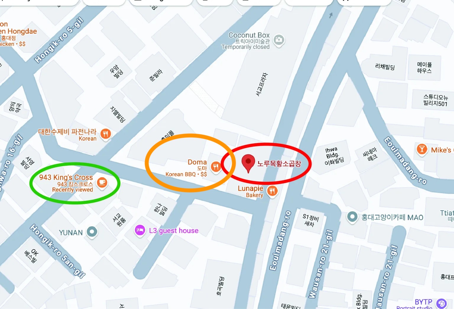 We took the bus going here, it’s near the 934 King’s Cross and the 노루목황소곱창.